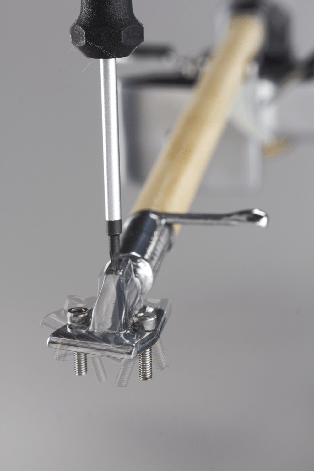 - Bei unserem freistehendem Tonarm Lignum L wird der Achsabstand mit Hilfe eines Drehknaufs/ horizontal verlaufende Spindel eingestellt.