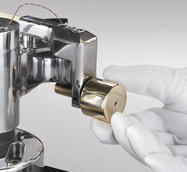 Mittels einer Tonarm-Waage wird die spezifische Auflagekraft des jeweilig eingebauten Abtastsystems eingestellt. Das feine Gewinde unseres aus reiner Bronze bestehenden Gewichts erlaubt eine sehr sensible Justierung.