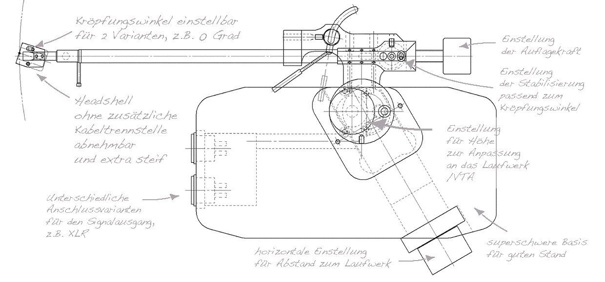 Es gibt zwei Möglichkeiten bei der Einstellung der Tonarmgeometrie: Der Tonarm kann völlig ohne Kröpfungwinkel betrieben werden. Oder mit einem Kröpfungswinkel nach BAERWALD. Das gibt Ihnen die Möglichkeit für audiophile Experimente.