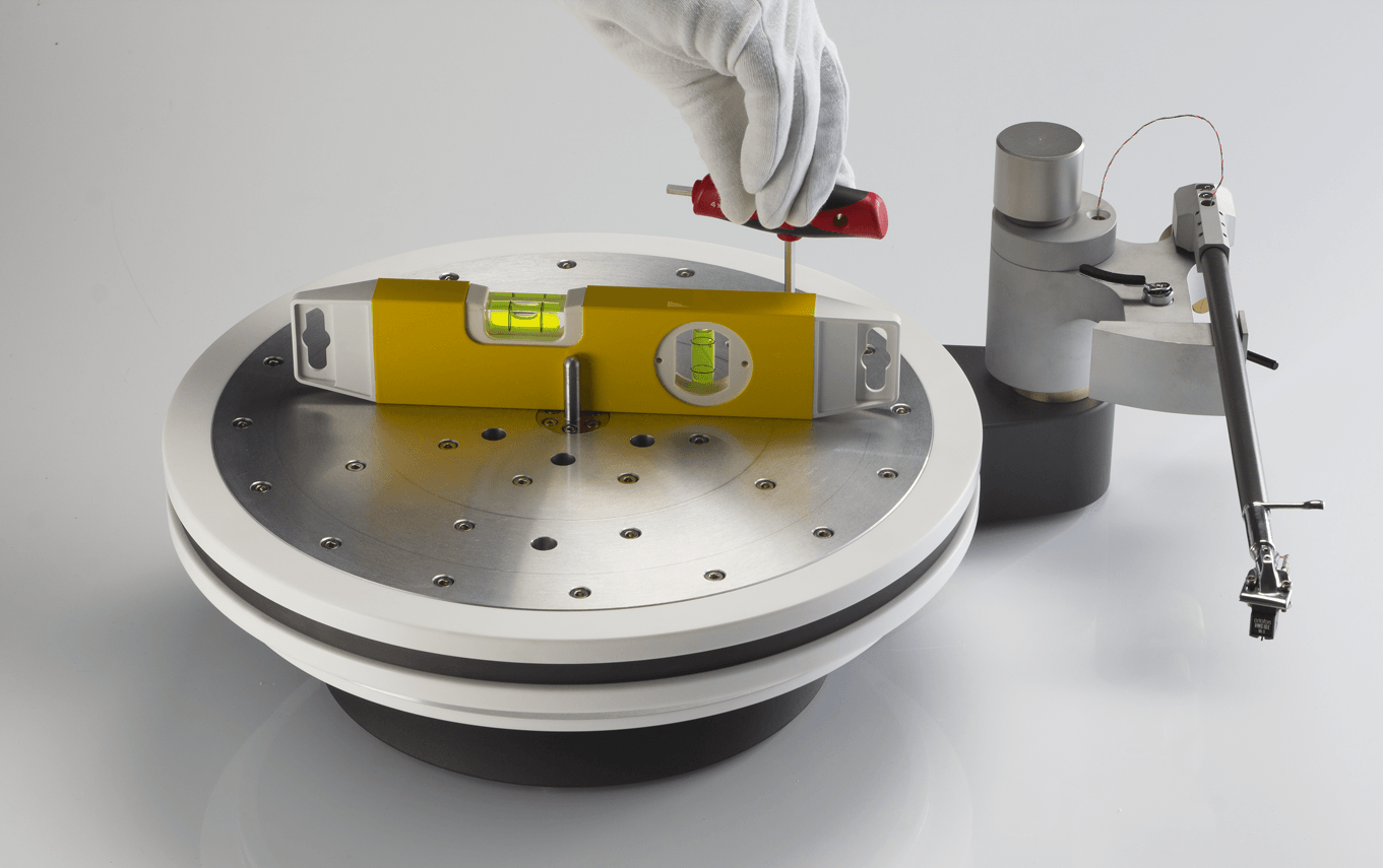 Der Plattenteller kann ganz einfach in die Waage gebracht werden durch Einstellen der am unteren Topf befindlichen Spikes. Diese werden durch den Teller hindurch mit dem mitgelieferten Sechskant-Stiftschlüssel justiert.