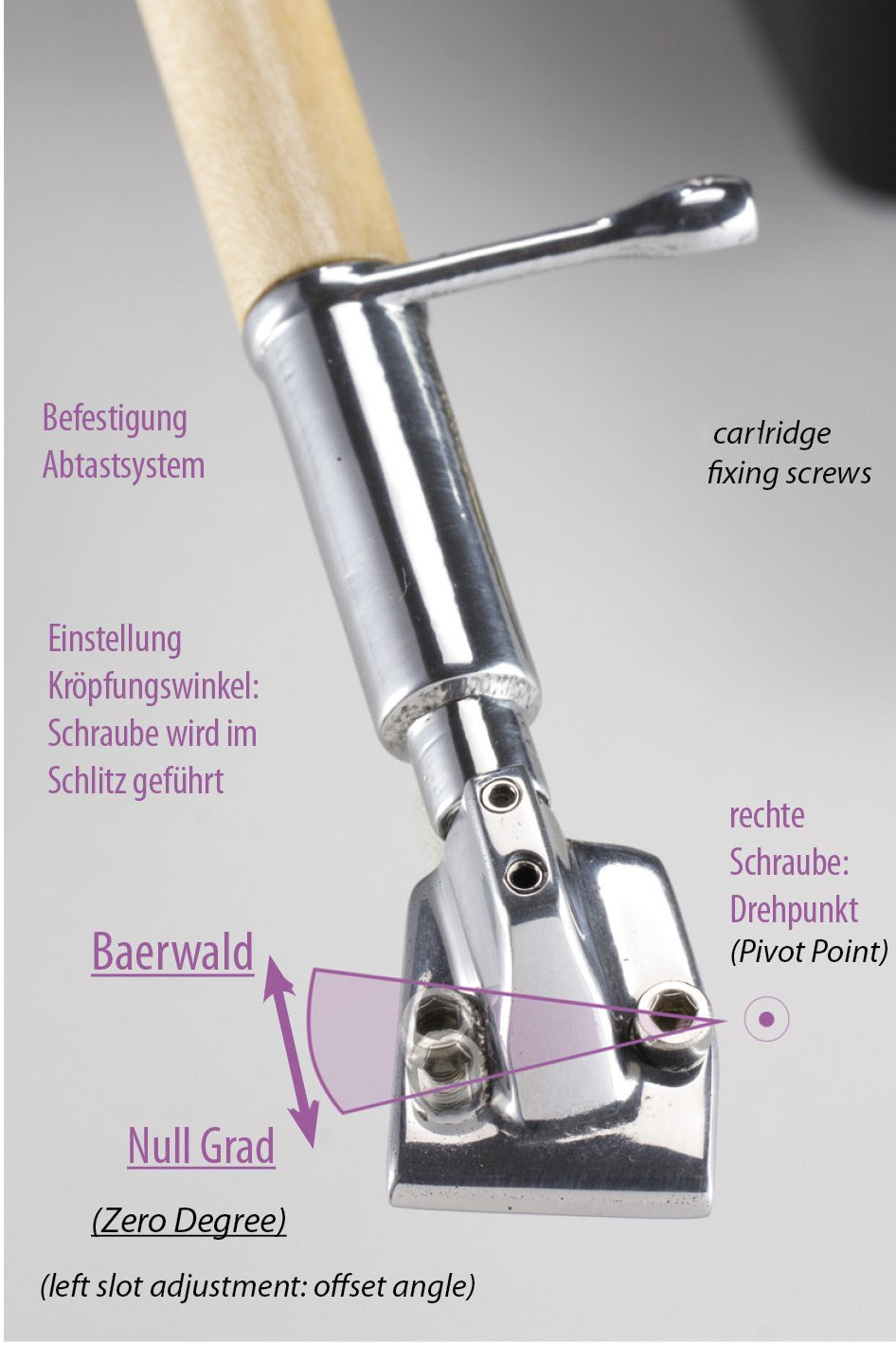 gerade Führung (Null Grad). Diese Auswahl bietet zusätzliche Möglichkeiten für audiophile Experimente. Die Stabilisierung des Tonarmlagers ist dann passend zum gewählten Kröpfungswinkel einstellbar.